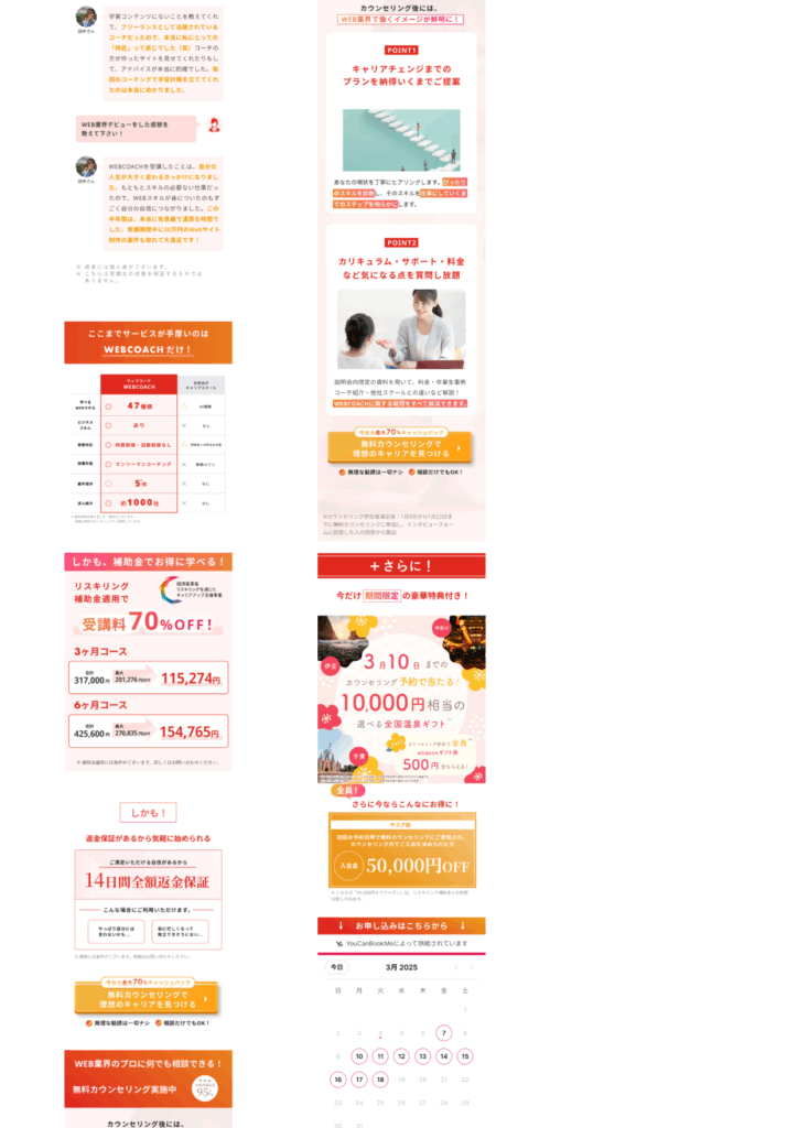 ランディングページ制作 2025年7月9日 最終更新日時 : 2025年7月9日 erinasaski 【製作時間】20時間【使用ソフト】Photoshop・illustrator・Figma・HTML・CSS・jquery【担当業務】デザイン・実装【意識した亊】スクロール離脱を防ぐためjqueryで動きをつけたLPを作成しました。